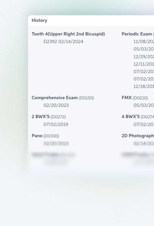 - Get detailed patient coverage - down to tooth-specific histories - for comprehensive treatment plans.