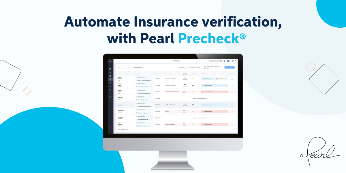 Precheckā¢is available as an add-on to Pearlās clinical performance platform Practice IntelligenceĀ®, which synthesizes radiologic AI findings with patient treatment data synced from practice management systems to deliver actionable insights that facilitate greater operational efficiency, better clinical care, and increased growth for dental practices. With Precheckā¢, Pearl gives users a powerful tool for extending Practice IntelligenceĀ® benefits to insurance-based revenue cycle management.