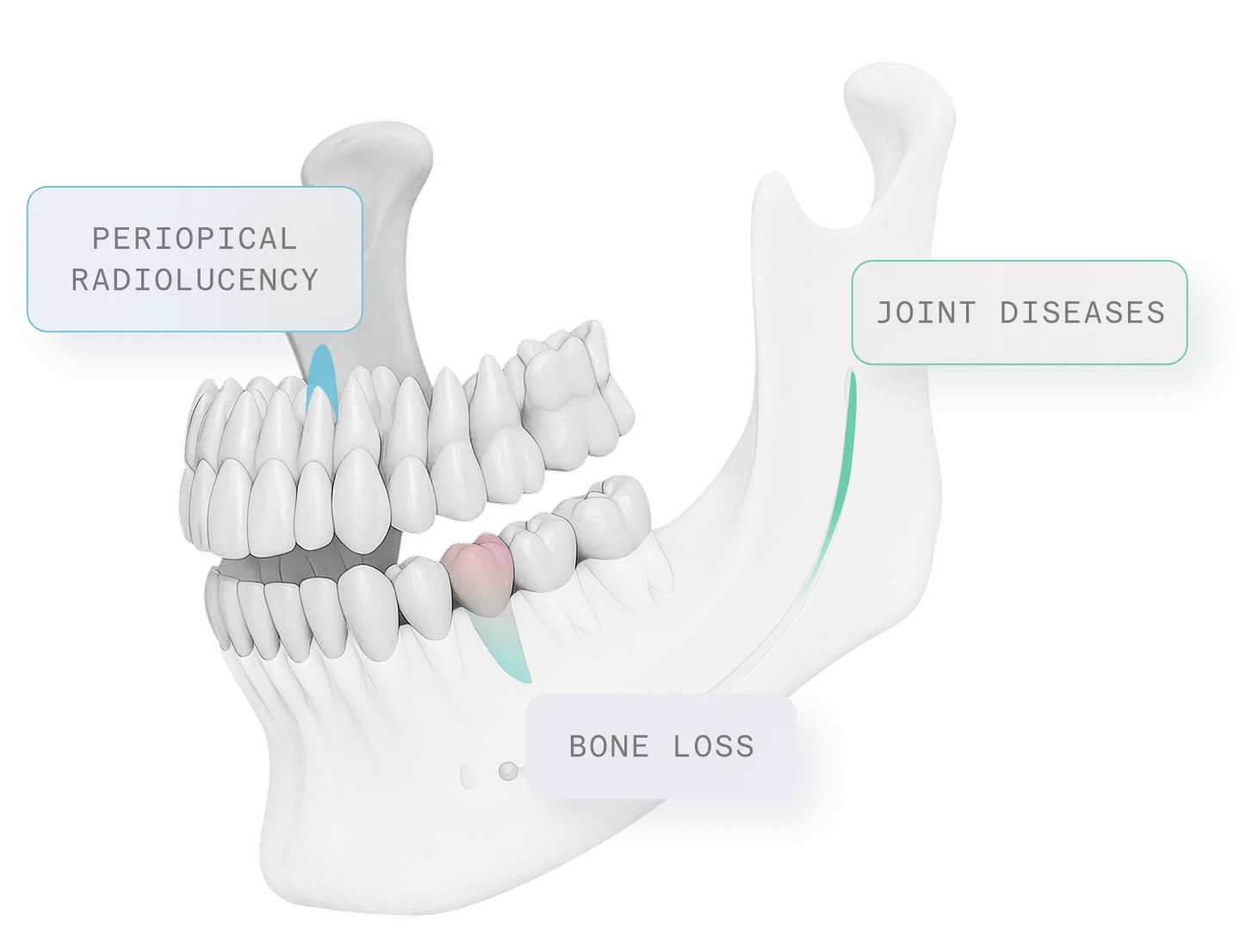 - AI highlights help dentists identify broken teeth, root fractures, nonodontogenic cysts, periimplantitis and bone defects and more