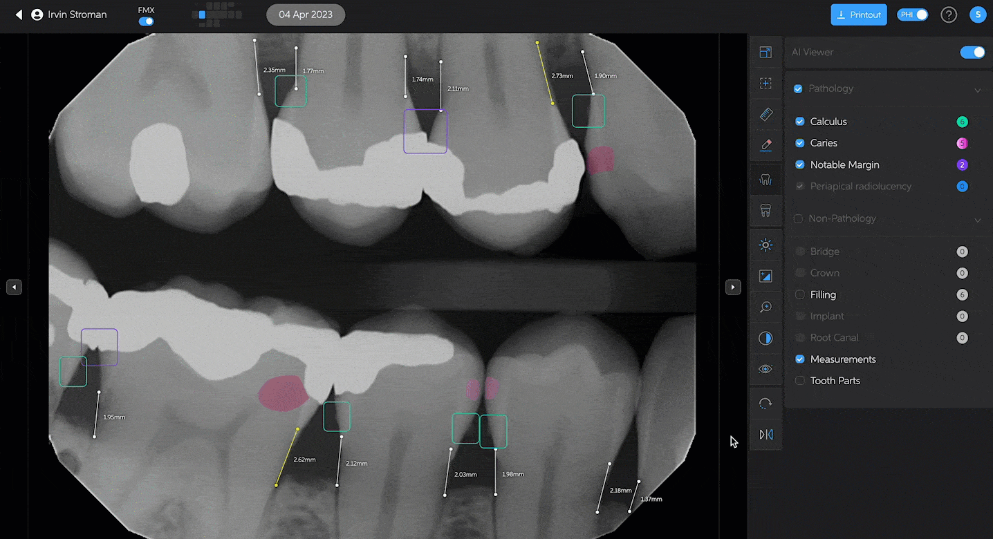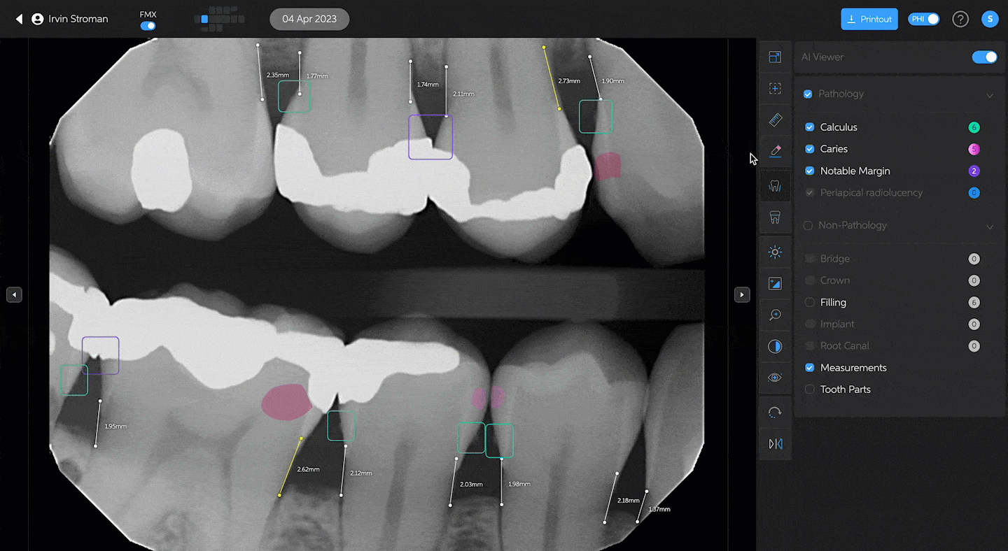 You can also use the edit tool to remove any detections you may not agree with. Simply click the edit button and hover over the detection. Click on the red 'x' and the detection will be removed from the radiograph. Click the edit button again to turn off the edit tool.