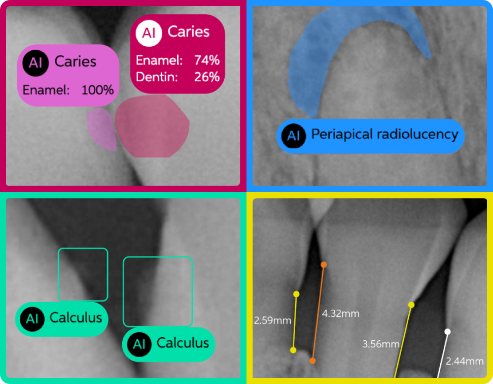 Enjoy more efficient, consistent, accurate and patient trusted x-ray evaluations––with the world's most advanced cloud-based chairside dental AI solution.